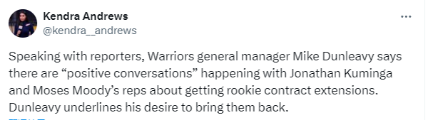 23-24赛季,库明加为勇士出战74场比赛,场均得到16.1分4.8篮板2.2助攻;穆迪则是出战66场,场均得到8.8分3篮板0.9助攻,今夏勇士曾为引援马尔卡宁而兜售穆迪,不过最终未能达成交易。