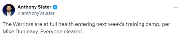 勇士总经理邓利维表示:在下周的训练营开始前,全队健康状况良好,所有球员均已获得参赛许可。