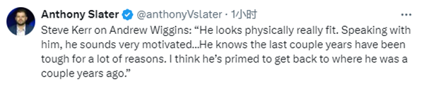 前段时间,维金斯的父亲去世,享年64岁;对于维金斯的状态,勇士主帅科尔表示:他看起来身体非常健康,而且很有动力,非常平静,过去几年他因为很多原因过得很艰难,我认为他已经准备好回到几年前的巅峰状态,我期待维金斯今年能有出色的表现。