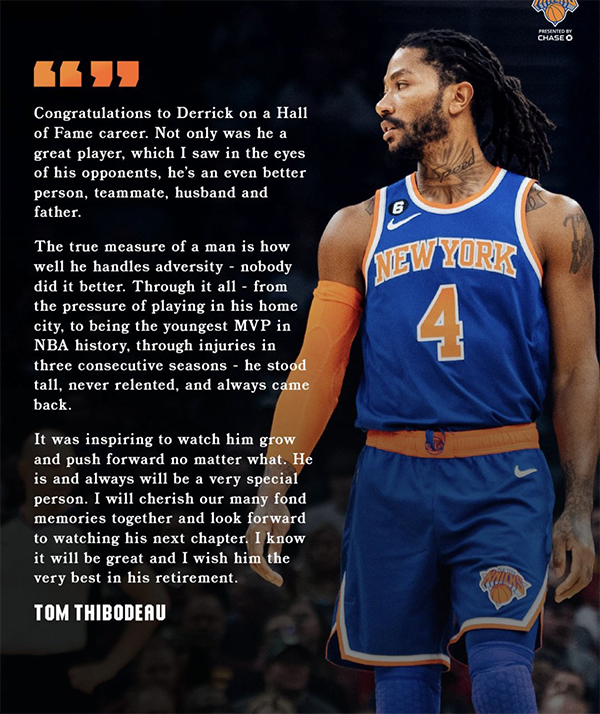 罗斯昔日恩师、尼克斯主帅锡伯杜发声:祝贺罗斯拥有名人堂级别的生涯,他不仅是一个伟大的球员,我从他对手的眼中看到了这一点,他还是一个更好的人、队友、丈夫和父亲。