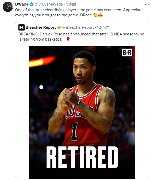 热火名宿韦德转发罗斯退役报道,并写道:这项运动史上最令人振奋的球员之一,感谢你为这项运动做出的一切。