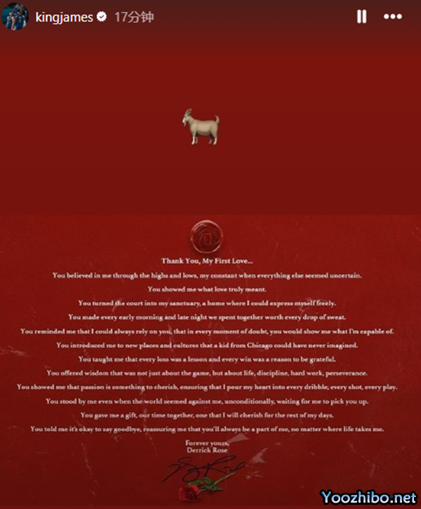 詹姆斯连续转发罗斯的退役声明,配文写道:充满爱意和尊重!!!致敬。永远载入史册的GOAT。