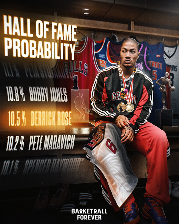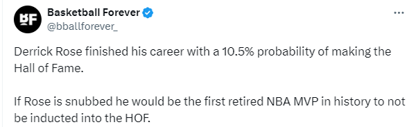 美媒Basketball Forever发推写道:罗斯职业入选名人堂的概率为10.5%。如果罗斯最终被冷落,他将成为历史上第一位退役后未入选名人堂MVP。