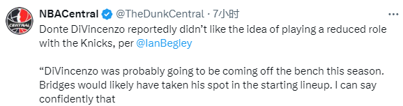据尼克斯记者Ian Begley报道,迪文琴佐新赛季不想打替补,该记者表示:迪文岑佐新赛季可能替补出战,布里奇斯会取代他在首发阵容中的位置,我可以肯定地说,他不喜欢新赛季上场时间/球队角色削弱的主意,他刚刚迎来生涯巅峰,并且在球队人手不足的情况下帮助球队赢下了大量比赛。