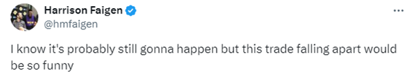 湖人记者Harrison Faigen表示我知道这笔交易很可能达成,但要是交易失败就有意思了。