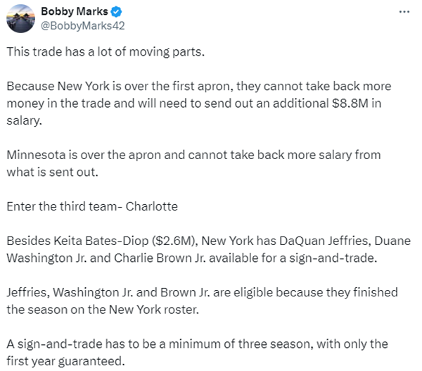 尼克斯和森林狼交易的第三方是夏洛特黄蜂。除了迪奥普(260万美元)之外,纽约还有杰弗里斯、杜安-华盛顿二世和查理-布朗二世可供先签后换,因为上赛季他们都在尼克斯大名单上,尼克斯可以这样操作。