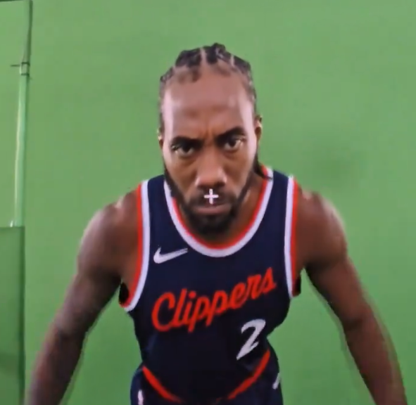 在快船队媒体日,小卡站在旋转台上拍摄定妆照,全场面无表情;小卡冲着镜头露出一副霸气的表情。