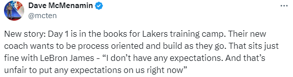 詹姆斯已经尽了最大的努力来保护他的球队免受雷迪克加盟带来的过早压力,被认为是竞争者可能让球队在赛季初期经历成长的痛苦。因此谈到湖人新阵容,詹姆斯表示:我没有任何期望,现在对我们寄予任何期望都是不公平的。我们唯一能互相依靠的就是我们每天如何训练和工作。