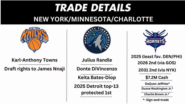 黄蜂得到:2025年次轮签(来自森林狼,在掘金、76人中顺位更高的一个)、2026年次轮签【来自尼克斯(来自勇士)】、2031年次轮签(来自尼克斯)、达坎-杰弗里斯(来自尼克斯,先签后换)、查理-布朗(来自尼克斯,先签后换)、小杜安-华盛顿(先签后换)、720万美元现金。