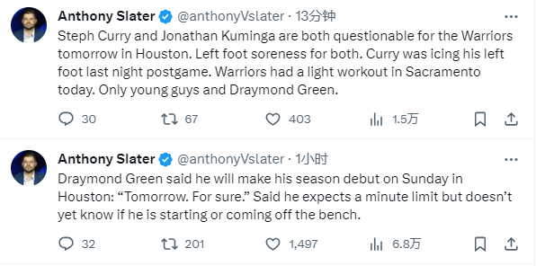 追梦格林确定复出战火箭,这将是他的赛季首秀,格林本人表态:明天,一定(出战);格林还表示预计会有上场时间限制,还不知道自己是首发还是替补。