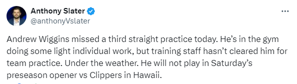 据勇士记者Anthnoy Slater报道,安德鲁-维金斯连续三次缺席球队的训练,他在健身房中进行了一些轻松的个人训练,但训练人员尚未批准他参加全队训练,他仍旧身体不适,将不会参加周日在夏威夷对阵快船的季前赛揭幕战。