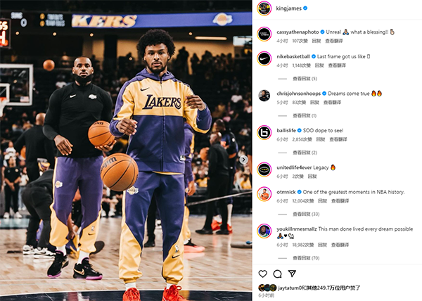 詹姆斯在Ins晒出与布朗尼同框的16张合影,从赛前同场热身到并肩作战,再到赛后一起离场,老詹以此来庆祝父子同台首次上演,詹姆斯动态引热议,好友祝他梦想成真,美媒直言这太酷了;短短6个小时,詹姆斯的动态获得将近250万点赞,塔图姆、布克、欧文等球星都为老詹点赞。