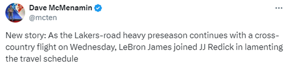 对于湖人的季前赛赛程,此前主教练雷迪克曾表示:对我们来说,这不是一个理想的季前赛。
