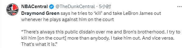 追梦格林公开表示,在球场上不会把克莱和他的好朋友勒布朗-詹姆斯区别对待,直言:我会撞穿他,因为以前我和我哥哥对抗的时候,我也总这样做。公众总是鄙视我和勒布朗的兄弟情谊。我比任何人都更想在球场上干掉他。反之亦然。就是这样,我比欧文更想撞穿勒布朗。