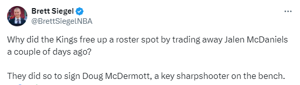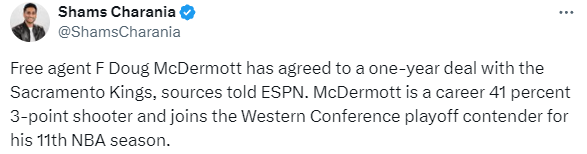 32岁神射手麦克德莫特已经加盟国王,NBA记者Brett Siegel跟进报道,与麦克德莫特签约,是国王选择将杰伦-麦克丹尼尔斯交易走的原因。