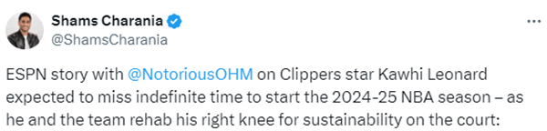 自上个赛季结束以来,小卡和快船尝试了多种治疗手段来控制炎症。篮球运营总裁劳伦斯-弗兰克在训练营开始时表示,自季后赛以来,炎症已显著减轻,但球队希望将这位明星球员的膝盖恢复到100%,并会采取一切预防措施。