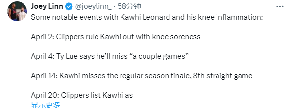 快船记者Farbod Esnaashari表示,关于过去六个月科怀-莱昂纳德受伤的怪异情况,我可以说很多。但是,我不会用糟糕的信息激怒大家;快船另一队记Joey Linn则收集了有关小卡膝盖炎症的消息,并整理成了时间线。