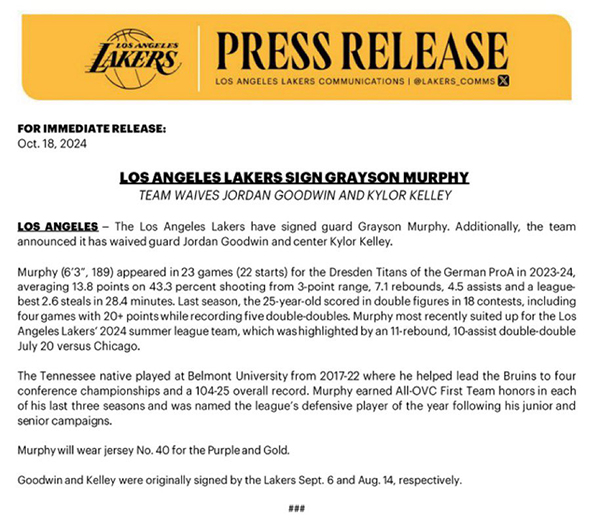 墨菲将身穿湖人40号球衣,今日季前赛收官战湖人将对阵勇士。