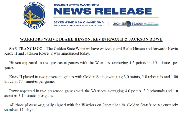 季前赛结束后联盟迎来裁员潮,勇士官方宣布,球队裁掉了布雷克-辛森、凯文-诺克斯和杰克逊-罗;辛森为勇士打了2场季前赛,场均上场5.3分钟拿到1.5分;诺克斯出战2场,场均上场7.4分钟,拿到3分2篮板1助攻;罗也是打了2场,场均上场6.4分钟拿到4分3篮板1助攻。