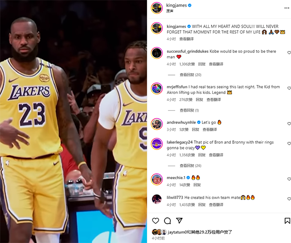 詹姆斯这一动态4小时获得130多万点赞,库里、浓眉、甜瓜安东尼、塔图姆等人都为老詹父子同台而点赞。