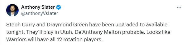 此前勇士宣布库里(右臀部挫伤)、德雷蒙德-格林(左膝盖挫伤)以及德安东尼-梅尔顿(右胸部挫伤)都出战成疑,对阵爵士赛前,库里和追梦的出战状态都升级为可以出战,梅尔顿大概率出战。