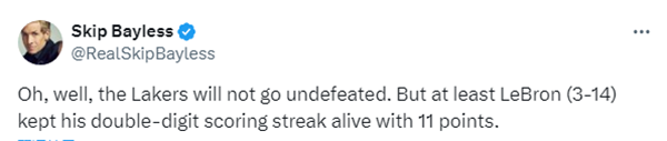 名嘴Skip更推道:好吧,湖人不会不败的。但勒布朗(14中3)得到了11分,延续了他连续得分上双的纪录。