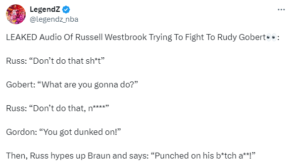 冲突原声大揭秘:威少爆粗怒怼戈贝尔 还喊队友揍他