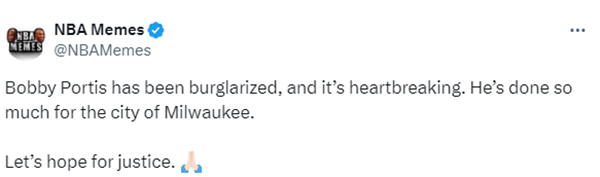 波蒂斯为雄鹿比赛期间家中被盗引热议,美媒表示他为密尔沃基贡献了一切,他的家中被盗太令人心碎了;雄鹿球迷表示:我们社区对多年来一直代表我们城市的人做出如此令人厌恶的行为,为鲍比祈祷,希望正义得到伸张。