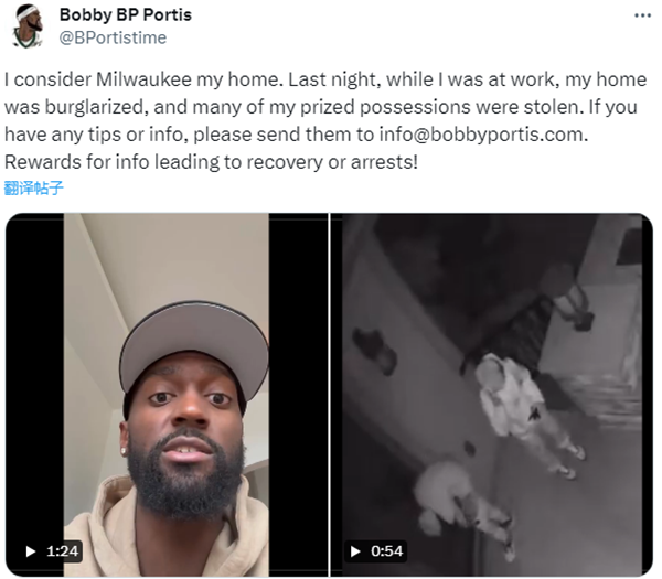 波蒂斯更新社交媒体,发推写道:我把密尔沃基视为我的家。昨晚,我在比赛的时候,我家被盗了,我的许多珍贵物品被偷走。如果您有任何线索或信息,请发送至我的邮箱,提供线索帮助追回或逮捕罪犯的,我将给予奖励。