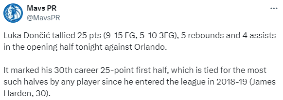 上半场,东契奇15投9中、三分10中5拿到25分5篮板4助攻,据统计,这是东契奇生涯第30次上半场至少拿到25分,追平了自2018-19赛季以来球员上半场得分25+次数最多纪录(18-19赛季以来哈登30次上半场25+)。