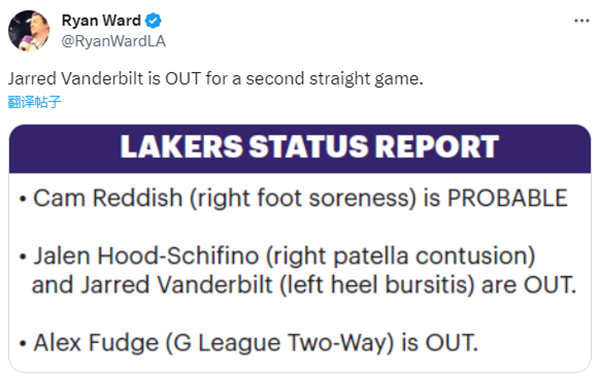 来源:JRS直播网10-26 16:10JRS直播网10月26日,湖人官方公布下一场对阵太阳的伤病报告,雷迪什(右脚酸痛)大概率出战,范德比尔特(左脚后跟酸痛)和席菲诺(右髌骨挫伤)因伤继续休战,福奇前往G联赛也缺席比赛;詹眉带队冲击赛季首胜,太阳三巨头有望首次合体。