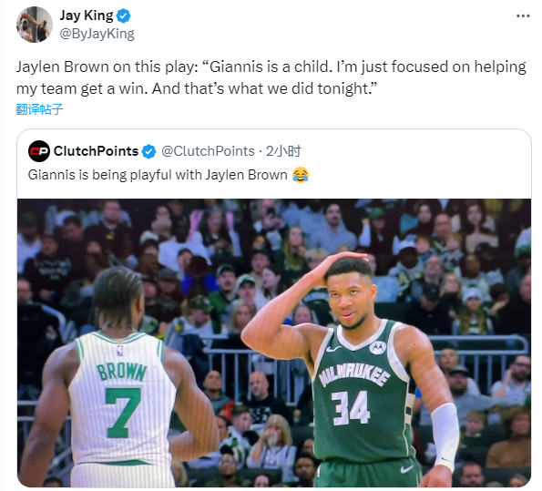 赛后谈到被字母戏耍,杰伦-布朗表示:扬尼斯还是个孩子,我只专注于帮助我的球队赢得胜利,这就是我们今晚所做的。