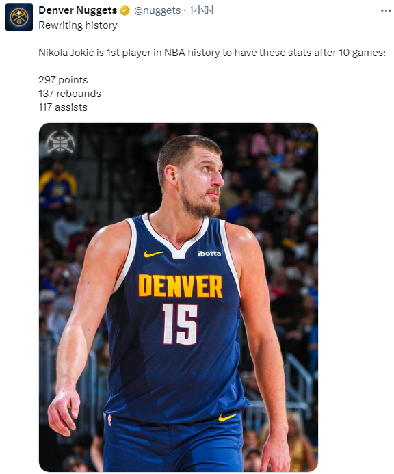 掘金官方不仅祝贺约基奇,而且晒出约基奇创造的新纪录:约基奇在本赛季前10场比赛中共得到297分137篮板117助攻,NBA历史第一人!