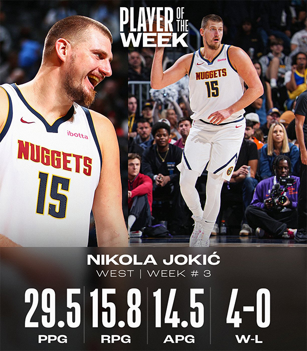 今日NBA官方公布新赛季第三周东西部周最佳球员,上周约基奇连续4场拿到三双,场均狂砍29.5分15.8篮板14.5助攻,力压詹姆斯、浓眉和欧文等球星,夺得西部周最佳;约基奇生涯第15次获此奖项,继续刷新掘金队史纪录。