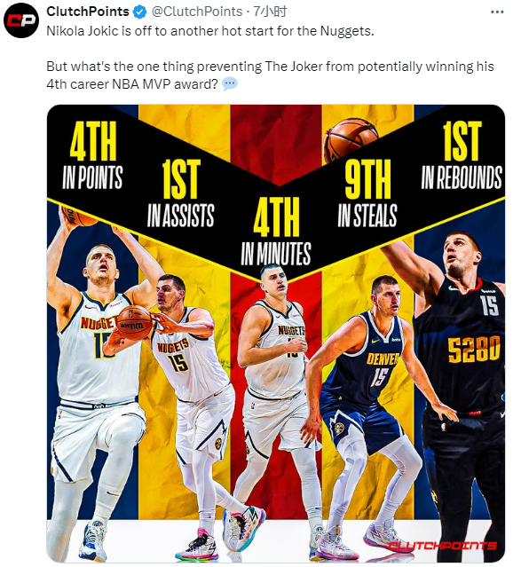 美媒ClutchPoints晒约基奇数据,场均助攻和篮板联盟第一,场均得分联盟第四,场均抢断联盟第九,场均上场时间联盟第四多:什么能阻挡他拿生涯第四个MVP?