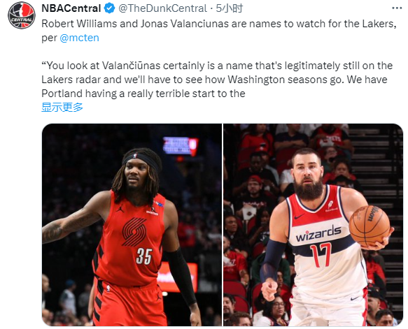 湖人内线遭遇伤病打击,据名记Dave McMenamin报道,罗伯特-威廉姆斯和约纳斯-瓦兰丘纳斯是湖人正在关注的球员;该记者表示:你看瓦兰丘纳斯,他确实是在湖人的考虑范围内,但我们还得看奇才本赛季的表现如何。开拓者的开局相当糟糕,但罗伯特-威廉姆斯三世近期的表现让他也重新进入了湖人的考虑范围。
