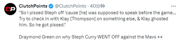 来源:JRS直播网11-14 16:06JRS直播网讯勇士主场击败独行侠,库里末节关键时刻连得12分接管比赛,亲手搞砸克莱的回家之夜;北京时间11月14日,追梦格林在节目中爆料,库里因克莱的冷漠而生气,我还在中间拱火。