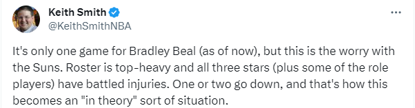 过去几年,比尔一直因伤病而长期缺席比赛,希望这一次,比尔的背伤不要太严重。对于比尔的情况,名记Keith Smith表示:这对比尔来说只是一场比赛(到目前为止),但这是太阳队的担忧。球队的阵容本来就头重脚轻,三位球星(加上一些角色球员)都在与伤病作斗争。