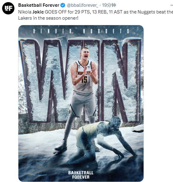 末节,面对湖人的追分,约基奇得分稳住局面,关键时刻穆雷等人输送火力,比赛还剩1分15秒,湖人提前放弃比赛,最终掘金119-107大胜湖人取得新赛季开门红。