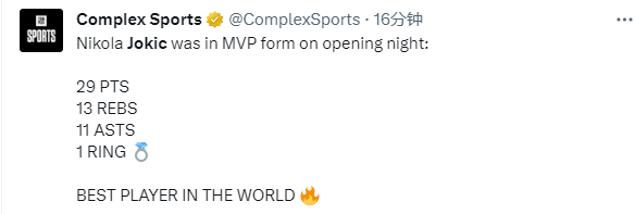 2、约基奇成为史上第三位以FMVP身份在揭幕战砍下三双的球员;前两人是詹姆斯(2016)和魔术师(1982)。