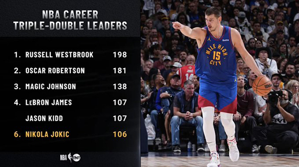 3、约基奇106次三双排名历史三双榜第6位,距离追平詹姆斯和基德并列历史第四仅差1次三双