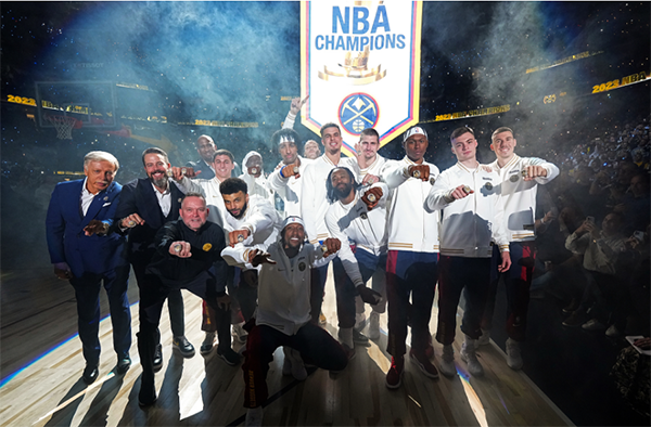 赛前,掘金全队正式颁发总冠军戒指,约基奇戴着戒指与全队合影,现场氛围太燃了。