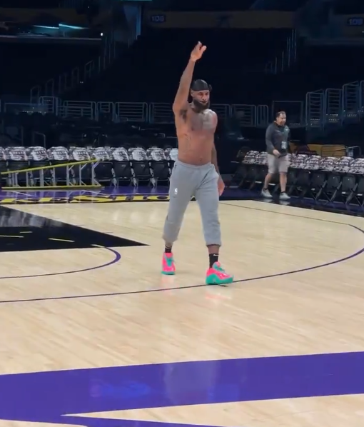 距离比赛开打还有4小时左右,詹姆斯早早来到球馆并且热身备战,赤膊上阵,站在球场中央命中超远三分;今日湖人全队将身穿城市版紫金战袍出战,城市版主场地板也已经铺好了。