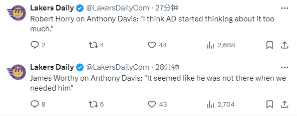 面对约基奇,浓眉全场19投6中拿到14分10篮板3助攻3抢断2盖帽,正负值-26。赛后NBA两大名宿批评浓眉,湖人名宿詹姆斯-沃西表示:当我们需要他的时候,浓眉似乎并不在线。