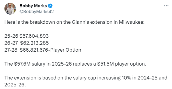 NBA薪资专家Bobby Marks跟进报道,字母哥3年1.86亿美元的合同细节——25-26赛季年薪5760万美元;26-27赛季年薪6221万美元和27-28赛季年薪为6682万美元,拥有球员选项,2025-26赛季5760万美元的薪水取代了 5150 万美元的球员选项。 此次提前续约是基于2024-25年和2025-26年工资帽增加10%。
