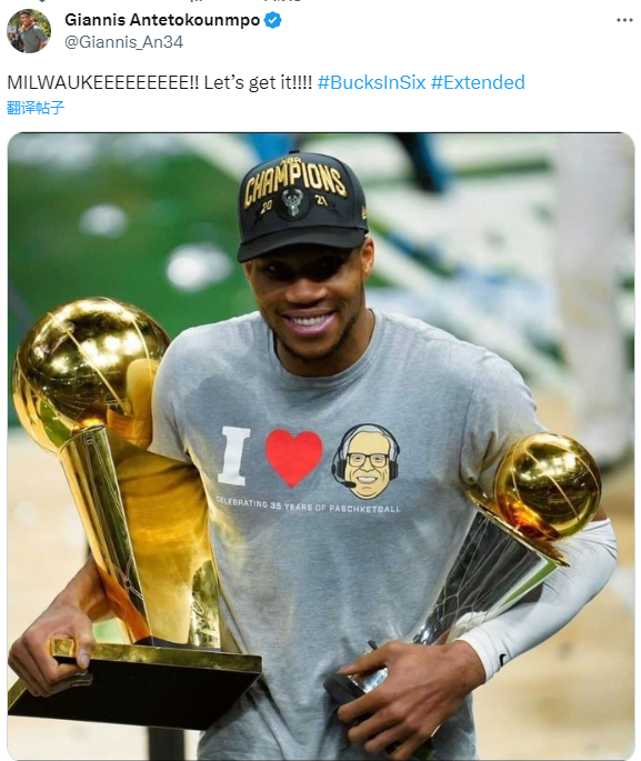 字母哥提前续约后第一时间发声,晒出自己抱着总冠军奖杯和FMVP奖杯的夺冠照,配文写道:密尔沃基!让我们再冲冠军!