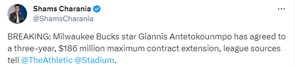 据名记shams报道,字母哥已经与雄鹿达成3年1.86亿美元的提前续约合同,续约后字母哥将在雄鹿效力至27-28赛季。
