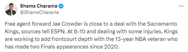 来源:JRS直播网11-27 16:38JRS直播网讯北京时间11月27日,据ESPN名记Shams Charania报道,自由球员杰-克劳德接近与国王达成一份签约合同,克劳德最快明天为国王出战迎来赛季首秀。