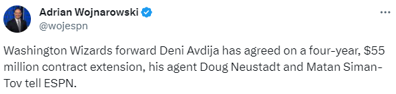 来源:JRS直播网10-23 10:39JRS直播网10月23日讯 ,据ESPN名记woj报道,奇才与前锋德尼-阿夫迪亚已经达成一份4年5500万的提前续约合同,合同全额保障。
