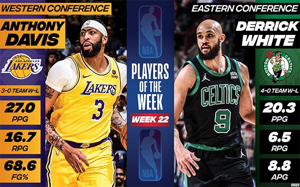 NBA官方正式公布周最佳,上周浓眉带领湖人取得3胜0负的战绩,场均能够得到27分16.7篮板,投篮命中率68.6%,荣获西部周最佳;怀特则是场均拿到20.3分6.5篮板8.8助攻,带领凯尔特人取得4胜0负的战绩,荣获东部周最佳。
